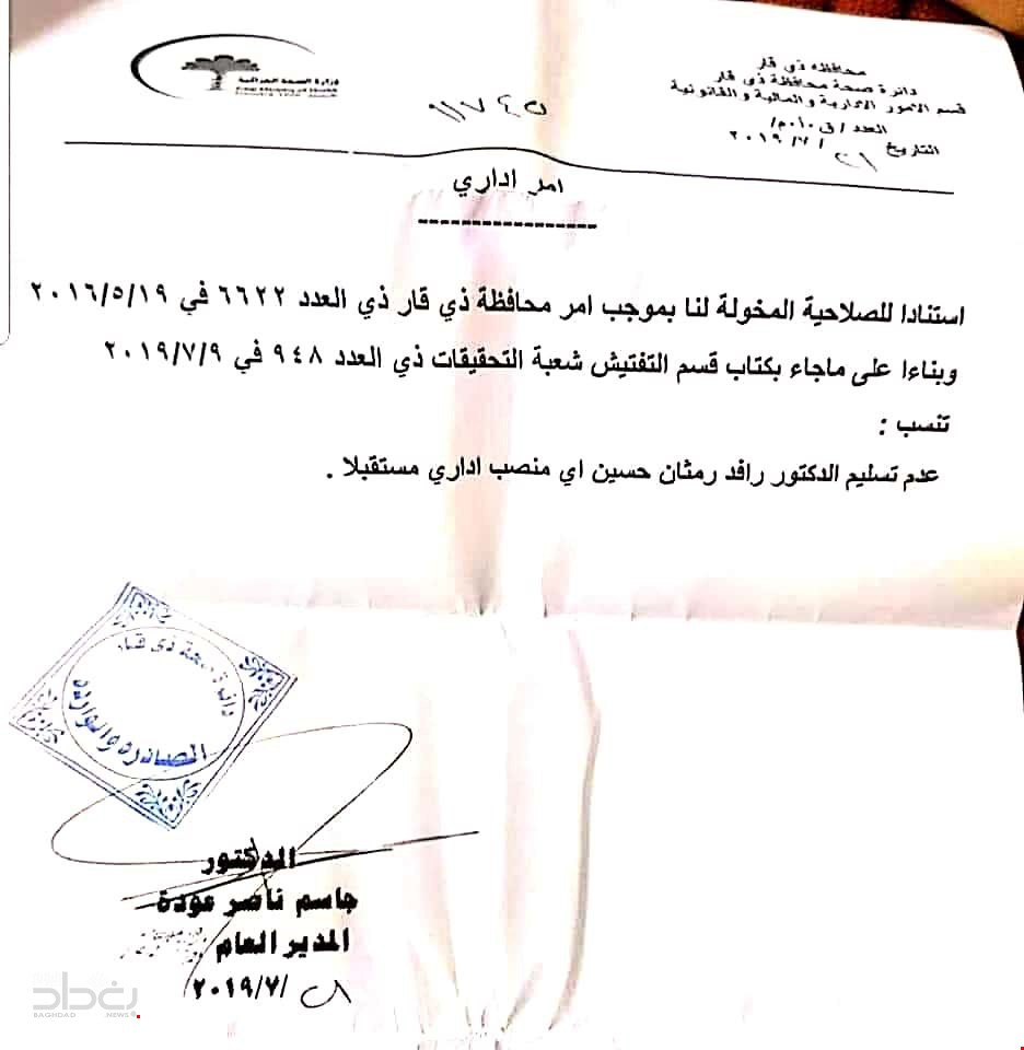 وفي وثيقة أخرى صادرة بتاريخ يوم الاحد 28 تموز، أمر مدير عام صحة ذي قار بـ"عدم تسليم الدكتور رافد رمثان حسين أي منصب اداري مستقبلا".