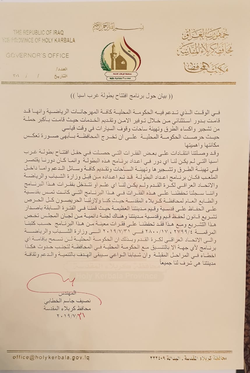 وقال محافظ كربلاء في بيان، ان "انتقادات وصلت لنا حول بعض الفقرات التي حصلت بحفل افتتاح بطولة غرب اسيا التي لم يكن لنا اي دور في اعداد برنامج هذه البطولة"، مبينا ان "دورنا يقتصر في تهيئة الطرق وتشجيرها وتهيئة الساحات وتقديم كافة وسائل الدعم".
