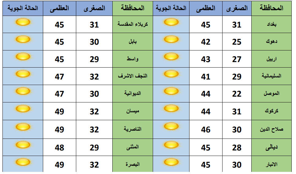 واشار الى ان بغداد ستسجل درجة حرارة عظمى تبلغ 45 درجة مئوية، فيما تسجل محافظات البصرة وميسان والناصرية 49 درجة مئوية، في حين تسجل السليمانية اقل درجات الحرارة والتي تصل لـ41 درجة مئوية.