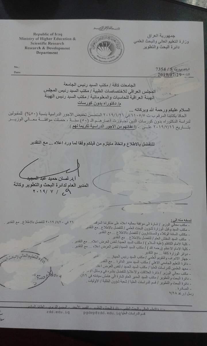 وافقت وزارة التعليم العالي والبحث العلمي، على اعفاء المقبولين في الدراسات العليا لدراسة الدكتوراه بدون كورسات ممن تتجاوز أعمارهم 50 سنة من دفع الأجور الدراسية تكريمآ لهم وكما موضح في الكتاب الرسمي ادناه: