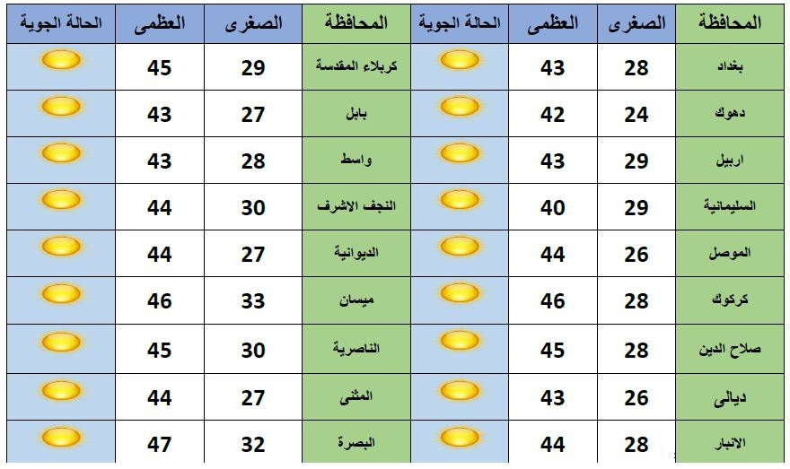 واشار الى ان بغداد ستسجل درجة حرارة عظمى تبلغ 43 درجة مئوية، فيما تستمر البصرة في تسجيل اعلى درجات الحرارة والتي تصل لـ47 درجة مئوية، في حين تسجل السليمانية اقل درجات الحرارة حيث تصل لـ40 درجة مئوية.