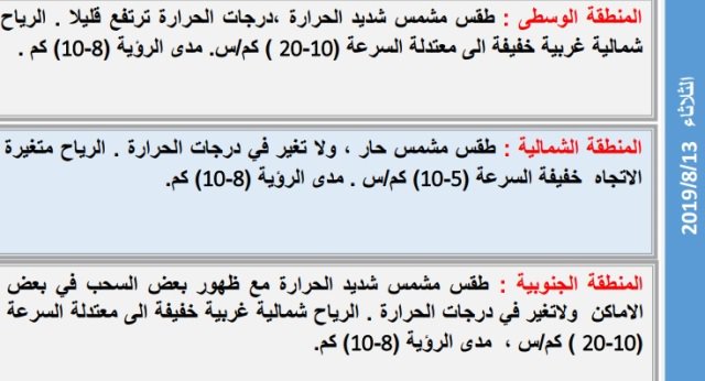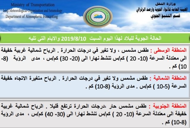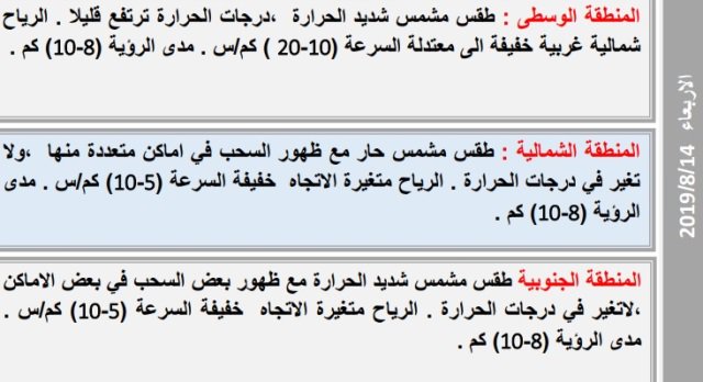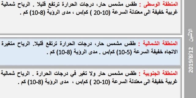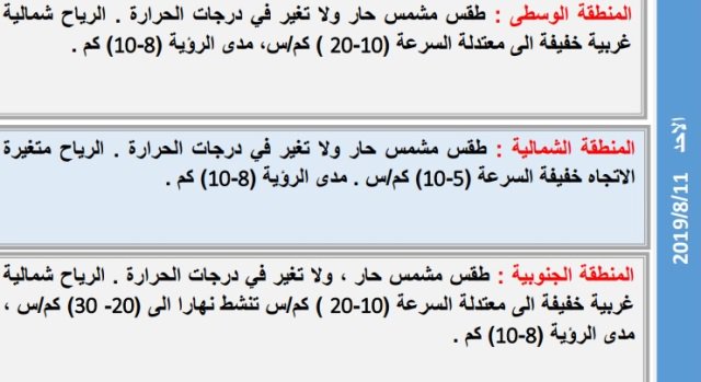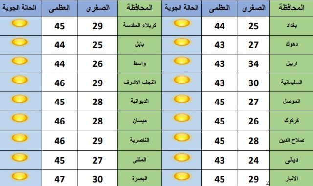 وبحسب تقرير هيئة الانواء عن حالة الطقس فأن "درجات الحرارة ستكون 44 درجة مئوية ترتفع خلال ايام الاثنين والثلاثاء والاربعاء قليلا".