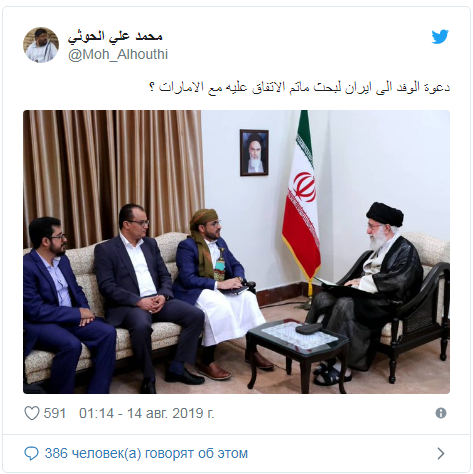 وكتب محمد علي الحوثي الذي يشغل منصب رئيس اللجنة الثورية العليا في "أنصار الله"، في تغريدة على "تويتر": "دعوة الوفد إلى إيران لبحث ما تم الاتفاق عليه مع الإمارات؟".