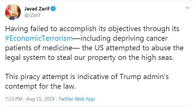 وقال ظريف في تغريدته : " أميركا حاولت سرقة ممتلكاتنا في أعالي البحار بعد أن فشلت في تحقيق أهدافها من خلال "الإرهاب الاقتصادي" .