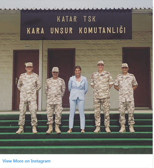 وقالت المذيعة والصحفية المشهورة في تقرير أعدته عن القاعدة التركية في قطر، في وقت سابق، إن "الجنود الأتراك يواصلون أداء واجباتهم في الدوحة، تحت قيادة القوات المشتركة القطرية التركية ودرجة حرارة تصل إلى 47 مئوية، وأعدادهم سوف تزيد في المستقبل القريب".