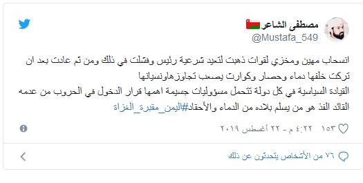 وقال “الشاعر” في تغريدة له بتويتر دون التصريح باسم الإمارات:”انسحاب مهين ومخزي لقوات ذهبت لتعيد شرعية رئيس وفشلت في ذلك ومن ثم عادت بعد ان تركت خلفها دماء وحصار وكوارث يصعب تجاوزها ونسيانها.