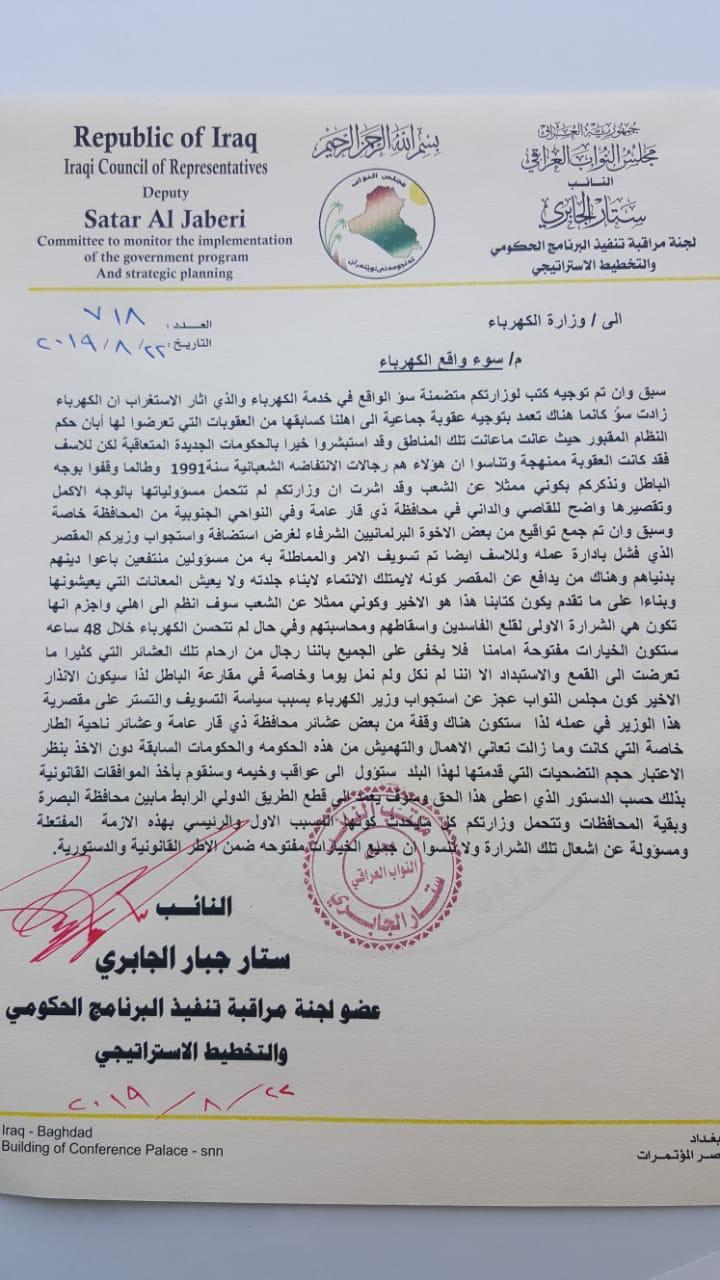وجه عضو لجنة مراقبة تنفيذ البرنامج الحكومي والتخطيط الستراتيجي ستار الجابر، انذار أخير لوزارة الكهرباء على خلفية سوء الخدمة في ذي قار.