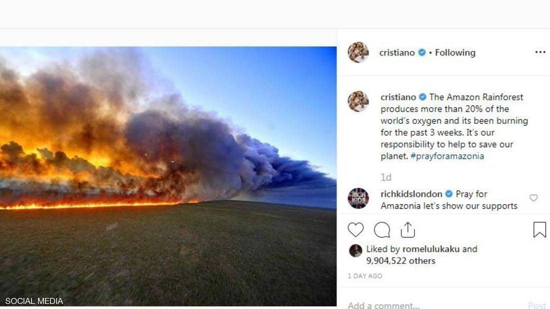 ونشر رونالدو على حسابه بموقع 'إنستغرام'، الجمعة، صورة لغابة تحترق، مع تعليق: "غابات الأمازون تنتج أكثر من 20 بالمئة من كمية الأوكسجين في العالم وهي تحترق خلال الأسابيع الثلاثة الماضية. مسؤوليتنا أن نساعد لإنقاذ الكوكب. صلوا من أجل الأمازون".