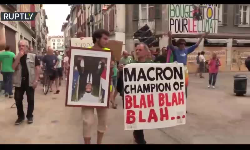 وهتف المشاركون بشعارات ضد الرأسمالية وسياسات المناخ وهم يحملون صور ماكرون بالمقلوب، سائرين في أزقة بايون قرب منتجع بياريتس، حيث تجمع هناك قادة العالم الرأسمالي من أجل قمة (G7).