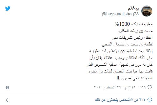 وقال المغرّد “بوغانم” -الشهير بتسريباته لما يدور داخل قصور الحكم الإماراتية والسعودية- إنّ “بن راشد” اعتقل رئيس تشريفات دبي وذلك بعد اختفاءه عن الانظار لمده طويلة، كاشفاً عن أن سبب الاعتقال يعود لدور “الشحي” في تسهيل عملية التصوير التي قامت بها زوجة “بن راشد” الأميرة هيا بنت الحسين لبنات “بن مكتوم” السجينات في قصره.