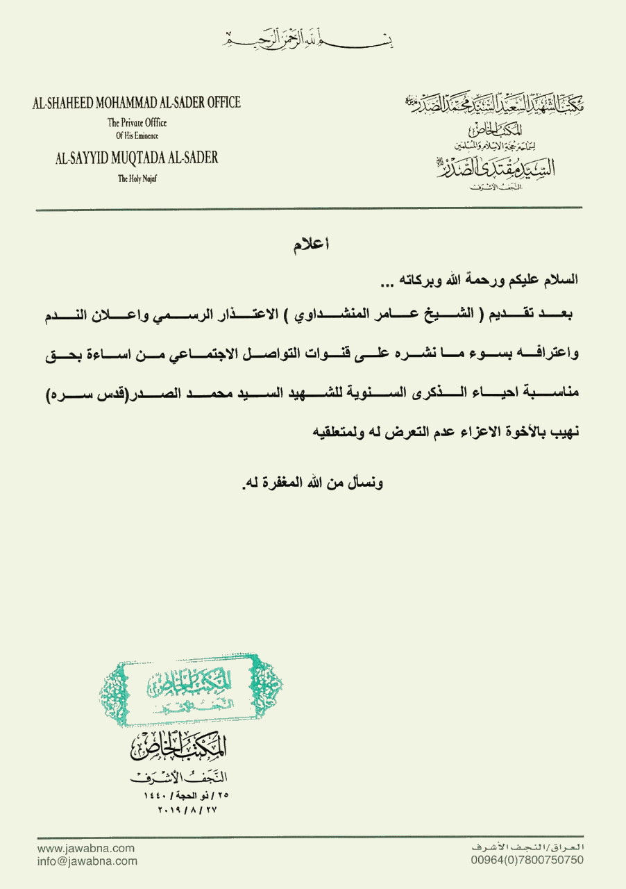 وقال المكتب في بيان : "عدم التعرض للشيخ عامر المنشداوي ومتعلقيه بعد اعتذاره بما قام به من نشر بمناسبة إحياء الذكرى السنوية للشهيد السعيد السيد محمد الصدر وتقديمه للندم والاعتذار".