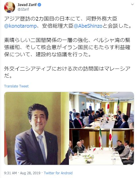 وفي تغريدة له باللغة اليابانية اشار ظريف الى محادثاته مع رئيس الوزراء الياباني شينزو آبي ووزير الخارجية تارو كونو وكتب: اجرينا محادثات بناءة حول المزيد من تعزيز العلاقات الثنائية وخفض التوتر في منطقة الخليج الفارسي وكذلك توفير مصالح الشعب الايراني من الاتفاق النووي.