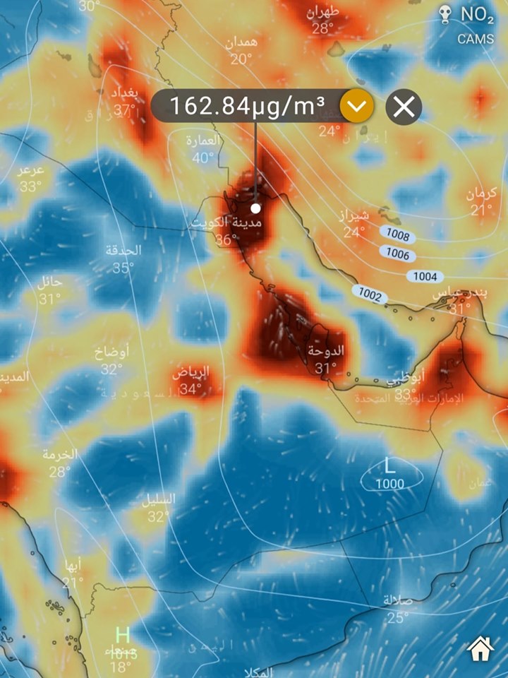 وقال المتنبئ الجوي صادق عطية في منشور على صفحته في الفيسبوك ان "غاز ثنائي اكسيد النيتروجين {NO2} السام سجل صباح اليوم اعلى نسبة تراكيز له في الكويت والسعودية وشرق البصرة، وربما يكون من المرجح هي احد مسببات حمرة الافق عند شروق الشمس صباح الاربعاء".