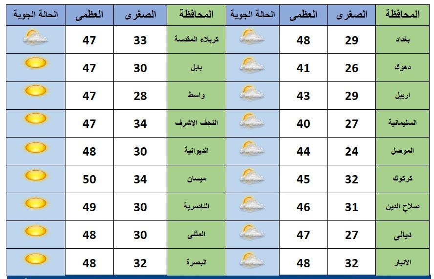 توقعت هيئة الانواء الجوية والرصد الزلزالي في العراق، اليوم الخميس، ان يكون الطقس في اغلب المحافظات مشمسا حارا، فيما أكدت وجود انخفاض متوقع في درجات الحرارة.