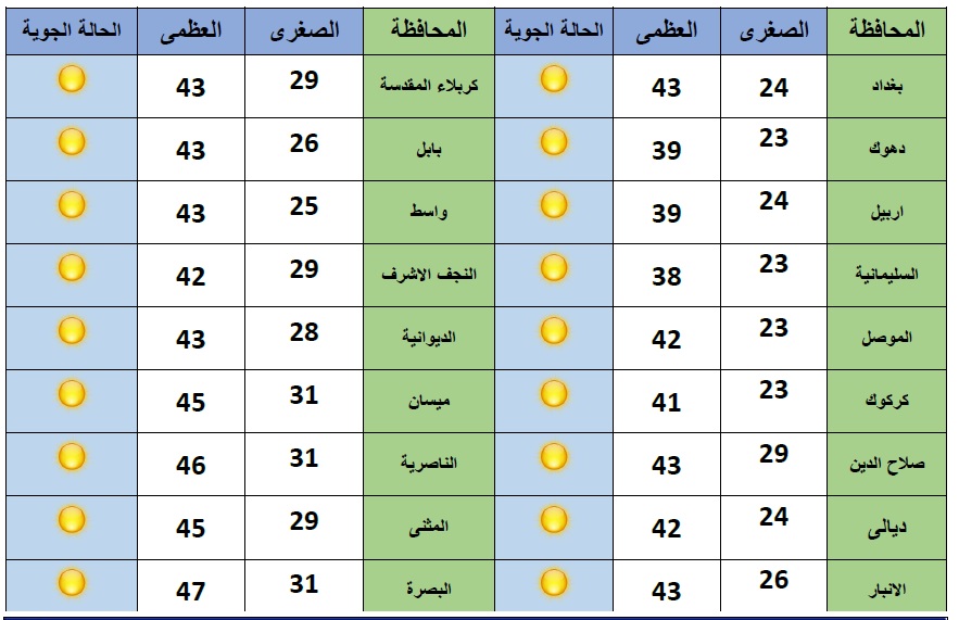 وذكر بيان للهيأة، ان "طقس يوم غد الخميس سيكون مشمساً في المنطقتين الوسطى والشمالية، وحاراً في الجنوبية مع بعض السحب" مشيراً الى ان "درجات الحرارة العظمى بمدينة بغداد ستكون بمعدل 43 مْ".