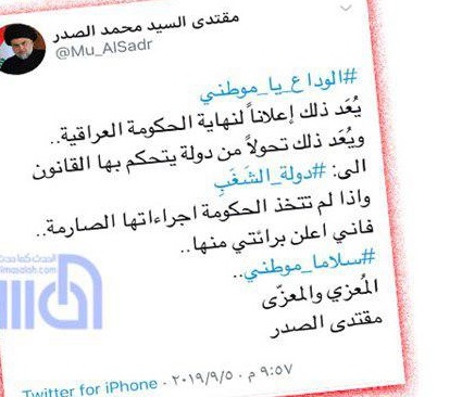 وقال الصدر في تغريدة له على حسابه الرسمي في تويتر، "الوداع يا موطني، حيث يعد ذلك اعلانا لنهاية الحكومة العراقية".