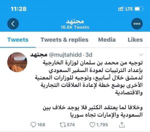 وجاء أيضاً في تغريدة مجتهد أنه: خلافاً لما يعتقد الكثيرون، لا يوجد خلاف بين السعودية والامارات تجاه سوريا.