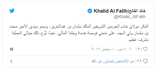كما اعرب "الفالح" في تغريدة عبر حسابه بـ "تويتر"، ليل السبت عن شكره وتقديره للملك سلمان بن عبدالعزيز، وولي عهده محمد بن سلمان على ماسماها بالفرصة التي حصل عليها لخدمة البلد.