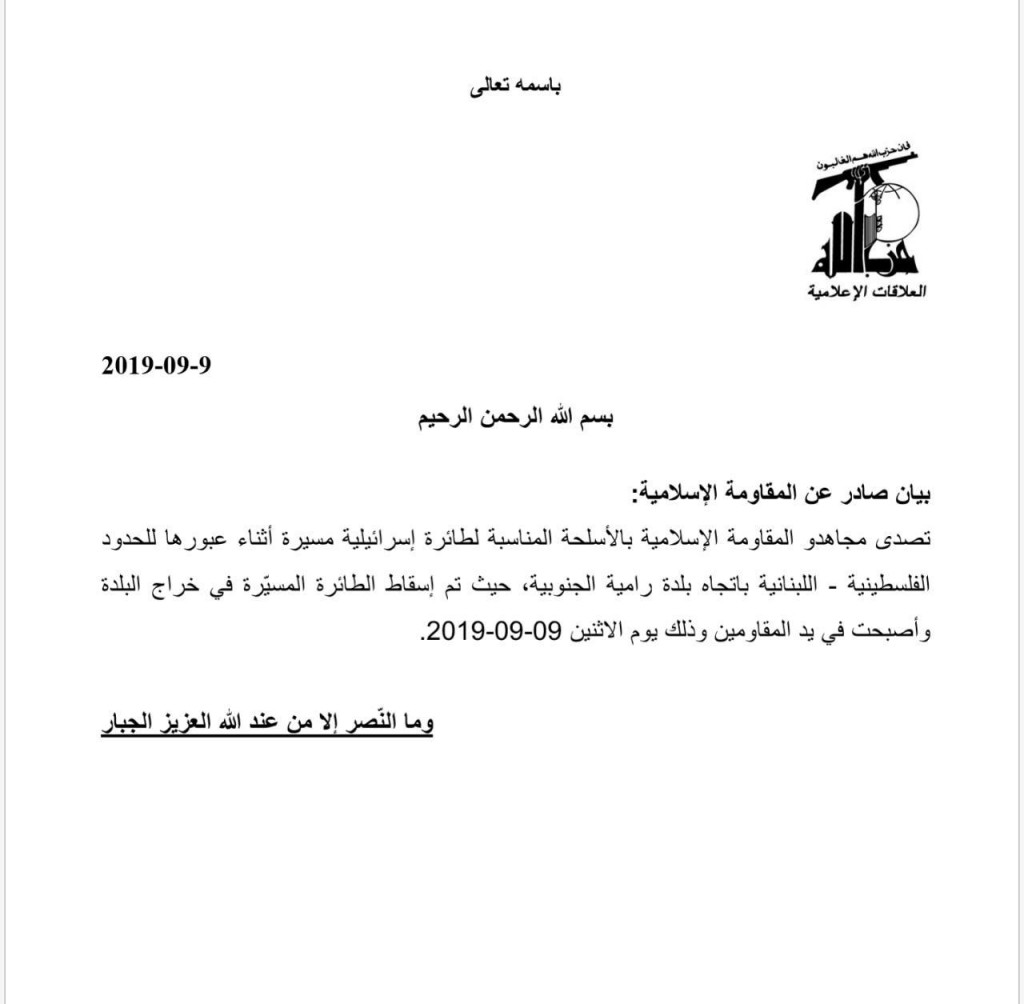 تصدى مجاهدو المقاومة الإسلامية بالأسلحة المناسبة لطائرة إسرائيلية مسيرة أثناء عبورها للحدود الفلسطينية - اللبنانية باتجاه بلدة رامية الجنوبية، حيث تم إسقاط الطائرة المسيّرة في خراج البلدة وأصبحت في يد المقاومين وذلك يوم الاثنين 09-09-2019.