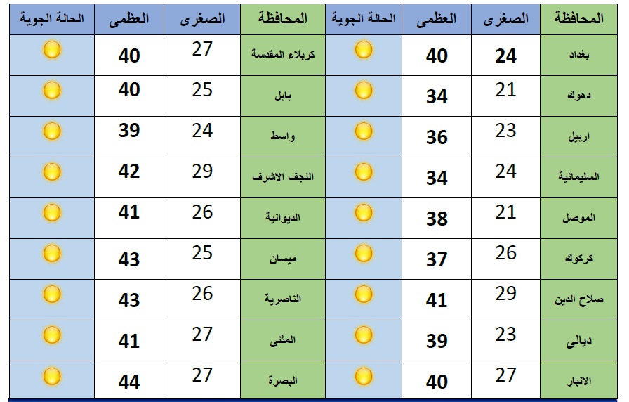 وذكر بيان للهيأة، ان "طقس يوم غد الثلاثاء {وهو يوم عاشوراء} سيكون مشمساً في المناطق كافة، وتكون درجة الحرارة العظمى بمدينتي بغداد وكربلاء بمعدل 40 درجة مئوية" وهي أدنى درجة للحرارة تسجلها الانواء الجوية في العراق منذ بداية أشهر الصيف اللاهب.