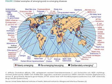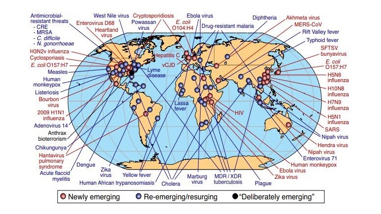 واحتوى التقرير الجديد على خارطة للعالم مع قائمة من الإصابات المحتملة التي يمكن أن تؤدي إلى اندلاع التفشي. وتم تقسيم الفئات إلى جزء "ناشئ حديثا" وآخر "عاد إلى الظهور/التجدد". وشملت الفيروسات الناشئة حديثا الإيبولا وزيكا وعدوى فيروس نيباه وخمسة أنواع من الإنفلونزا، أما الفيروسات التي تعود إلى الظهور، فشملت فيروس غرب النيل ومقاومة المضادات الحيوية والحصبة والتهاب النخاع الرخو الحاد، والحمى الصفراء وحمى الضنك والطاعون وجدري القرود البشري.