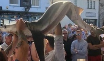 وتُظهر الصور التي اُلتقطت في الحدث الذي أقيم في مدينة بليموث، في جنوب غرب إنجلترا، سمكة القرش التي كانت محمولة أمام الجمهور، قبل استخدامها كجزء من فعالية حصة الطهي على المسرح.