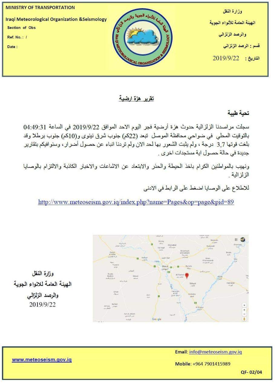 وذكر بيان لهيئة الأنواء الجوية والرصد الزلزالي ان مراصدها "سجلت حدوث هزة أرضية فجر اليوم في جنوب ناحية برطلة شرق الموصل في الساعة الرابعة و49 دقيقة و31 ثانية بالتوقيت المحلي لضواحي المدينة".