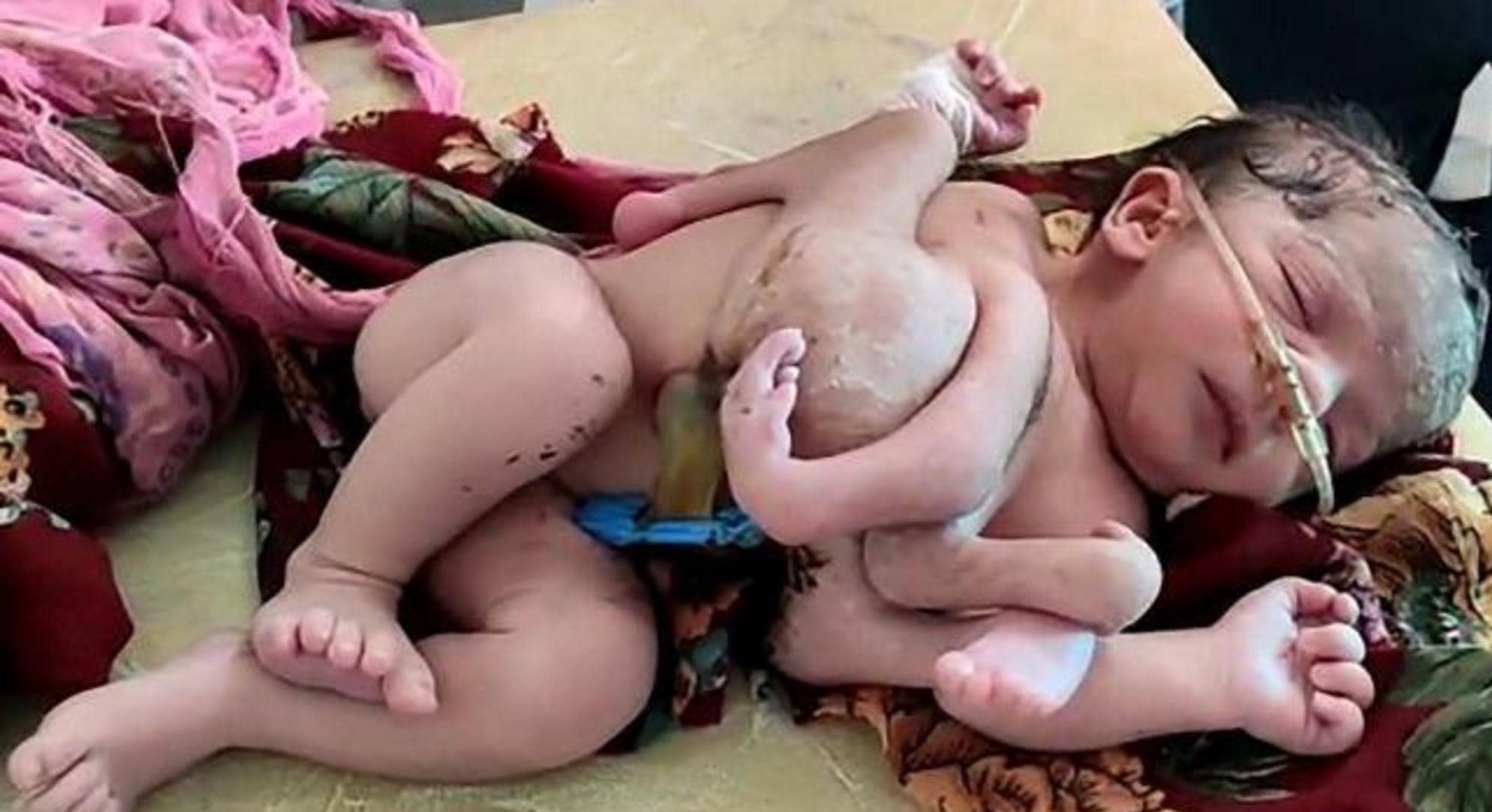 وبحسب الأطباء، فقد كانت الولادة طبيعية، وصحة الطفل الذكر جيدة، بينما التوأم الملتصق هو لأنثى، كانت بأربع أرجل وثلاث أياد.