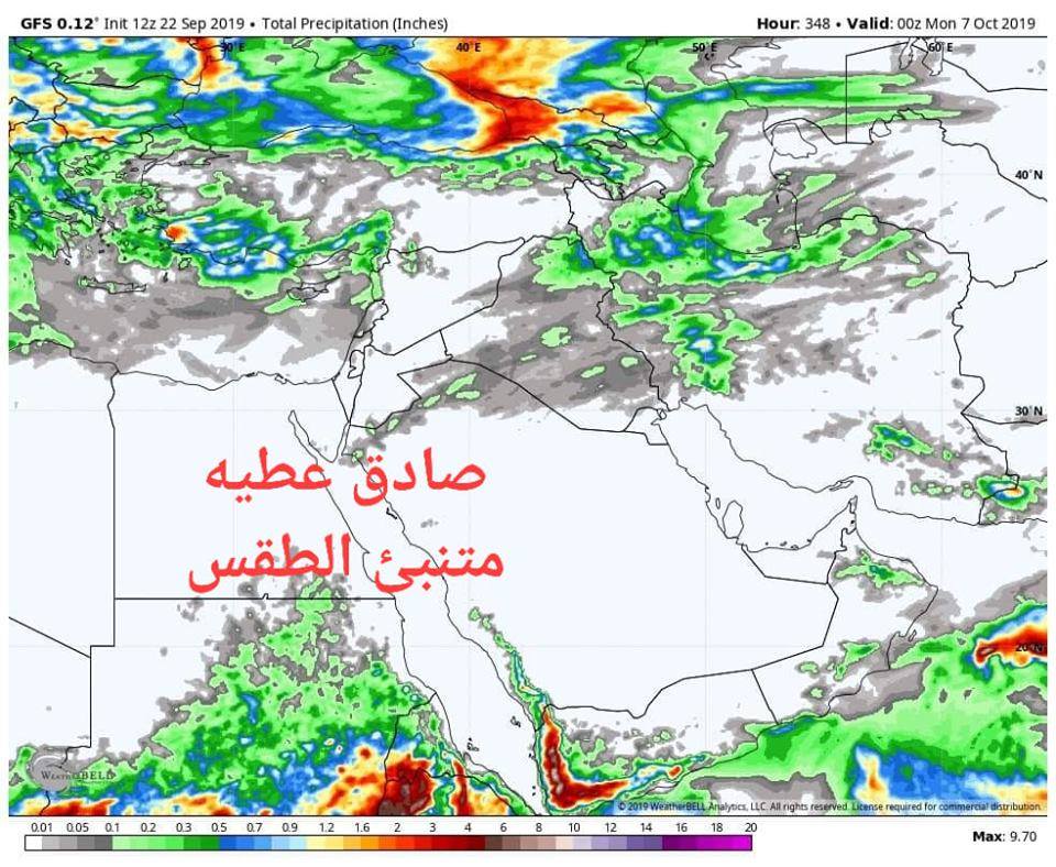وهذه هي خارطة كميات واماكن هطول الأمطار بداية الشهر المقبل من الموديل الاميركي.