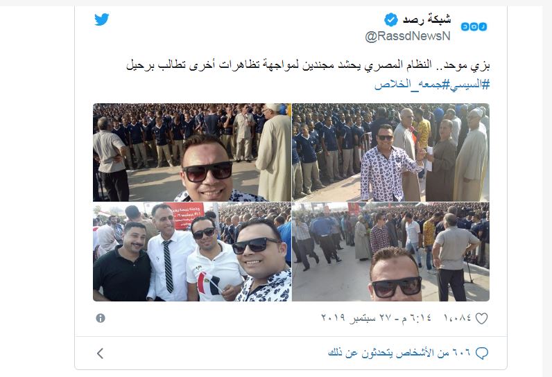 كما تداول النشطاء صور تظهر قيام السلطات المصرية بحشد جنود الأمن المركزي بزي مدني موحد لدعم مظاهرة تأييد السيسي أمام المنصة.