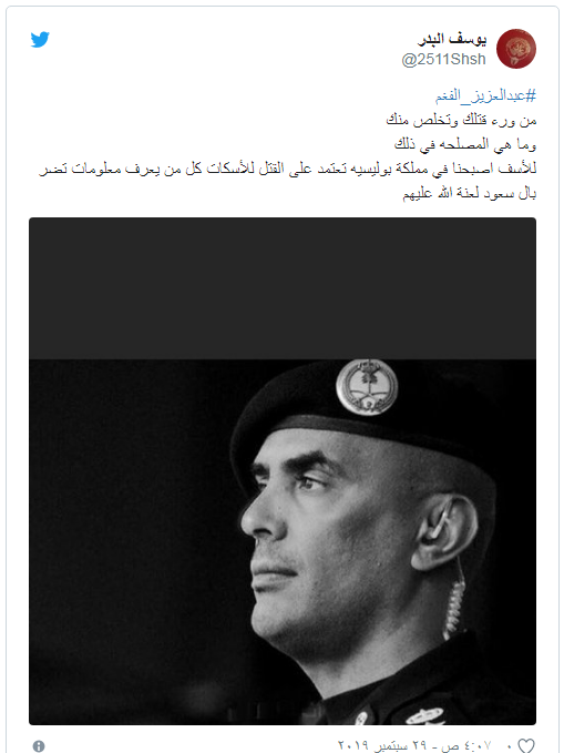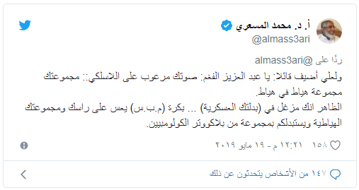 وقال المسعري في تغريدة نشرها على حسابه بـ"تويتر"، في مايو/أيار الماضي: "يا عبدالعزيز الفغم.. بكرة (غدا) محمد بن سلمان يعس على راسك ومجموعتك، ويستبدلكم بمجموعة من بلاك ووتر الكولومبيين".