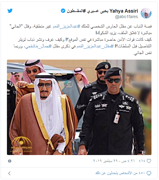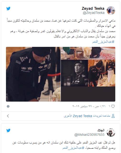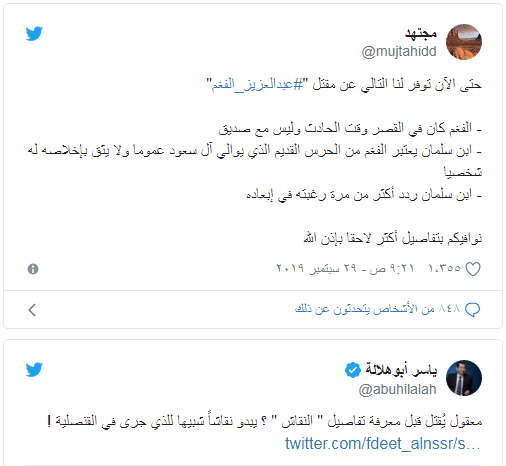 حيث قال حساب "مجتهد"، الذي دأب على نشر تسريبات من داخل أروقة النظام السعودي، على حسابه بموقع "تويتر": إن "الفغم كان في القصر وقت الحادث وليس مع صديق"، كما تحدثت حسابات غير رسمية.