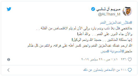 الشيخة مريم آل الثاني، كان لها أيضا رأي يرجح نظرية الإغتيال، حيث قالت ما نصه: "خاشقجي قتل بلا ذنب وبدم بارد وإلى الآن لم يتم الاقتصاص من القتلة.. والآن جاء الدور على الفغم.. والله أعلم! إنها مملكة المناشير.. حسبنا الله ونعم الوكيل! الله ارحم عبدك عبدالعزيز الفغم واجبر كسر أهله على فراقه، وانتقم من كل ظالم متجبر".