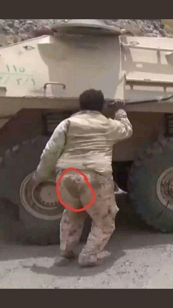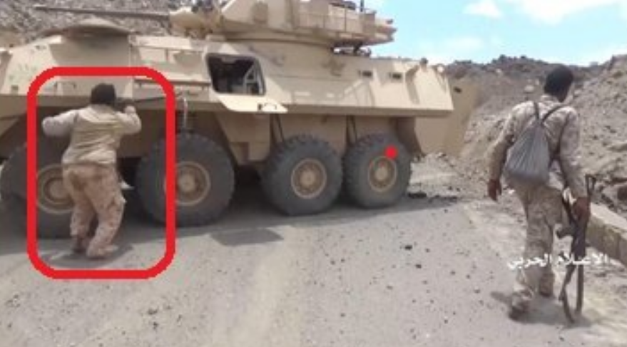ومن ضمن الصور التي وثقها الإعلام الحربي اليمني، صورة "مخزية" لأسير سعودي بلل سرواله من الخوف والرعب الذي انتابه بعد نزوله من المدرعة التي كان يتمترس بداخلها، ليقع هو ومدرعته أسيرا في قبضة الجيش اليمني واللجان الشعبية.