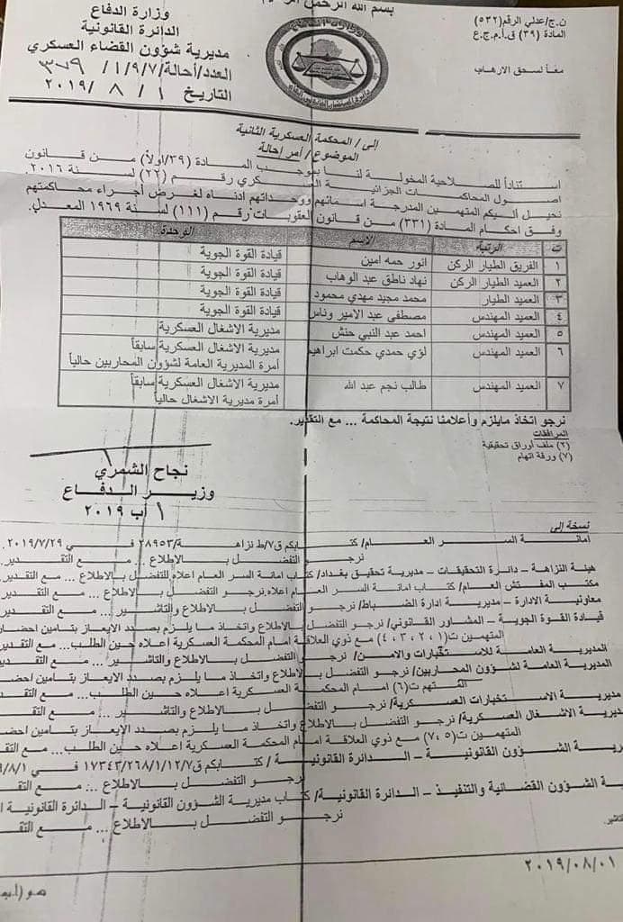 كشفت وثيقة مسربة، عن إحالة قائد القوة الجوية الفريق الركن انور حمه امين، مع ستة من الضباط الاخرين إلى القضاء من قبل وزير الدفاع نجاح الشمري، بتهم تتعلق بالفساد.