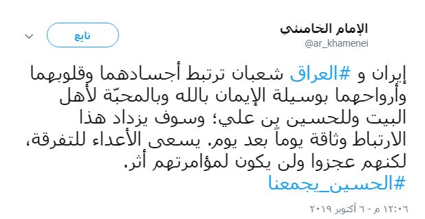 وجاء في نص تغريدة نشرت على الصفحة التابعة لموقع سماحة القائد: "إيران والعراق شعبان ترتبط أجسادهما وقلوبهما وأرواحهما بوسيلة الإيمان بالله وبالمحبّة لأهل البيت وللحسين بن علي؛ وسوف يزداد هذا الارتباط وثاقة يوماً بعد يوم. يسعى الأعداء للتفرقة، لكنهم عجزوا ولن يكون لمؤامرتهم أثر. #الحسين_يجمعنا"
