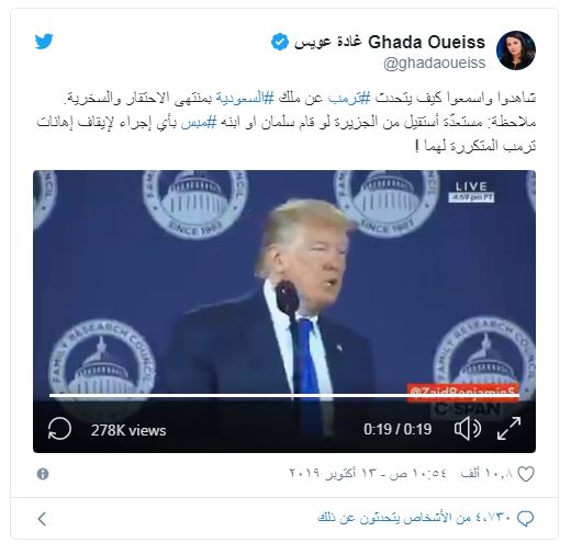 وعلقت على الفيديو قائلة: "شاهدوا واسمعوا كيف يتحدث #ترمب عن ملك #السعودية بمنتهى الاحتقار والسخرية".
