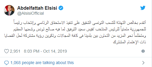 وكتب السيسي على حساباته الرسمية في مواقع التواصل الاجتماعي متمنيا للرئيس المنتخب قيس سعيد، "التوفيق لما فيه صالح تونس"