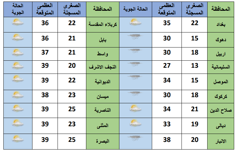 واشارت الهيئة في بيانها الى ان بغداد ستسجل درجة حرارة عظمى تبلغ 35 مئوية، في حين تكون السليمانية الاكثر انخفاضا في درجات الحرارة بتسجيلها 27 مئوية، كما تتقاسم المناطق الجنوبية درجات حرارة تبلغ ما بين الـ37 الى 39 مئوية.