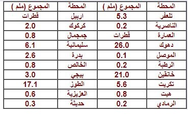 وبينت ان حصة مدينة دهوك من الامطار المتساقطة خلال الـ24 ساعة الماضية كانت الاكبر من بين المدن العراقية، حيث بلغت كمية الترسبات المطرية فيها (26) ملم، تلاها قضاء خانقين بكمية (21) ملم، في حين جاء قضاء الدوز ثالثا بتسجيله (17.1) ملم، كما حصلت السليمانية على (6.1) ملم.