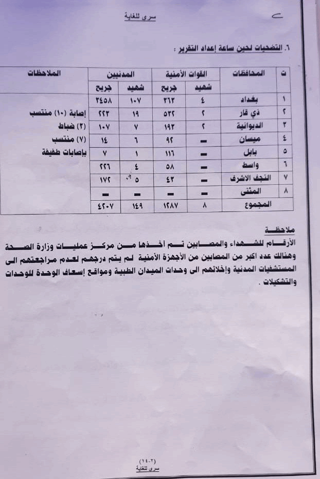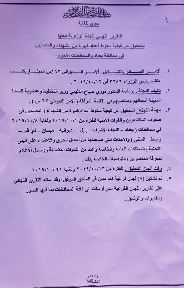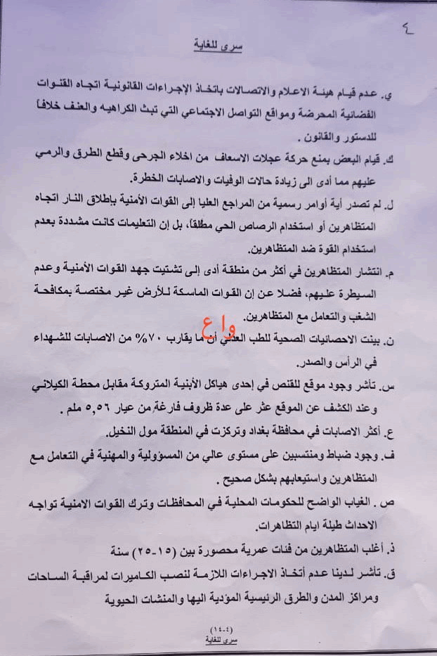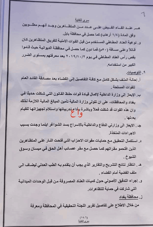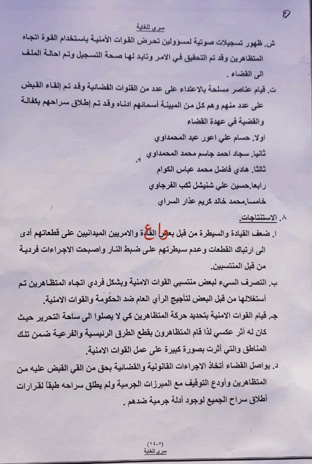 واشار التقرير الى تورط ضباط في واسط بإطلاق النار على المتظاهرين واعتقالهم واوصى بإعفاء قائد شرطة واسط.