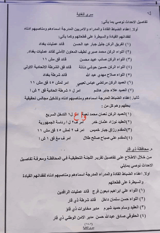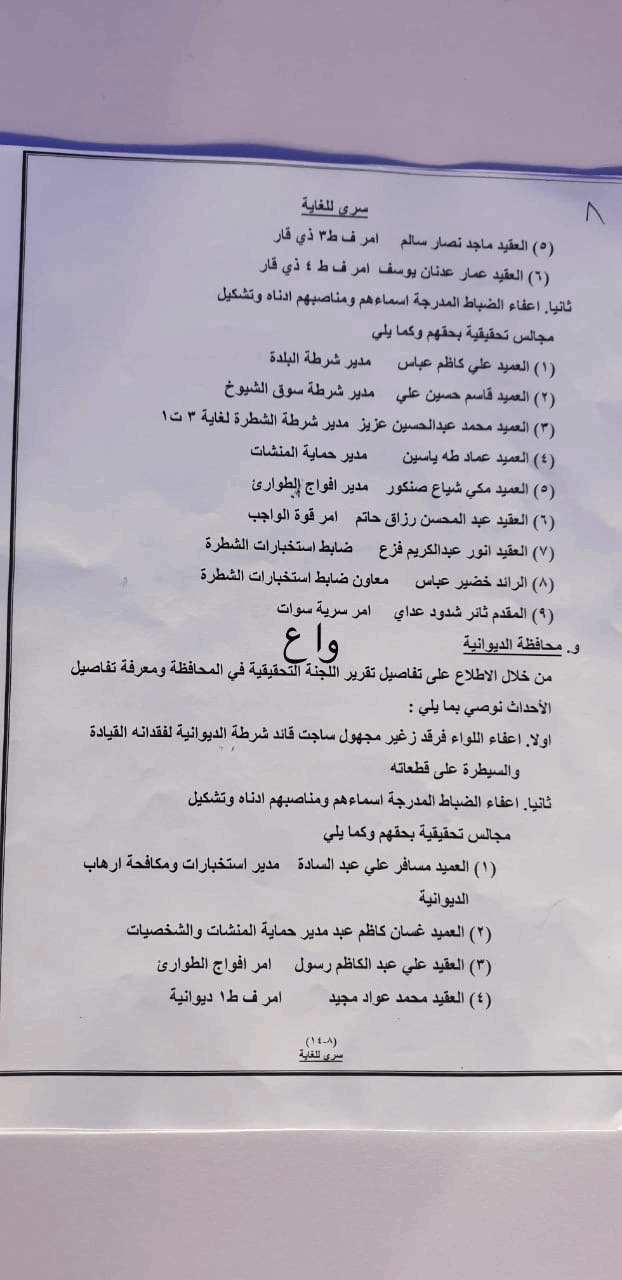 كما قدم تقرير اللجنة توصية بإعفاء قائد شرطة ميسان.