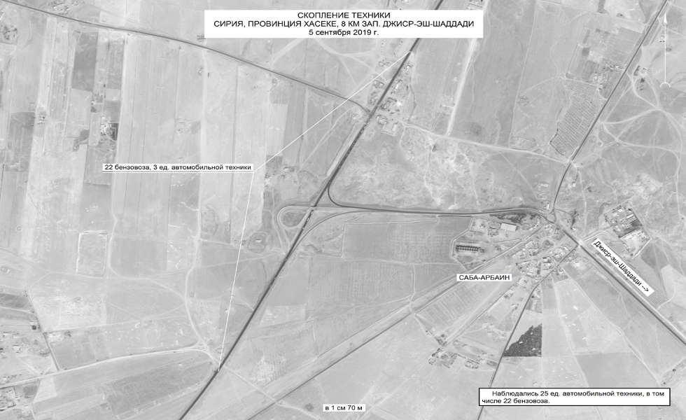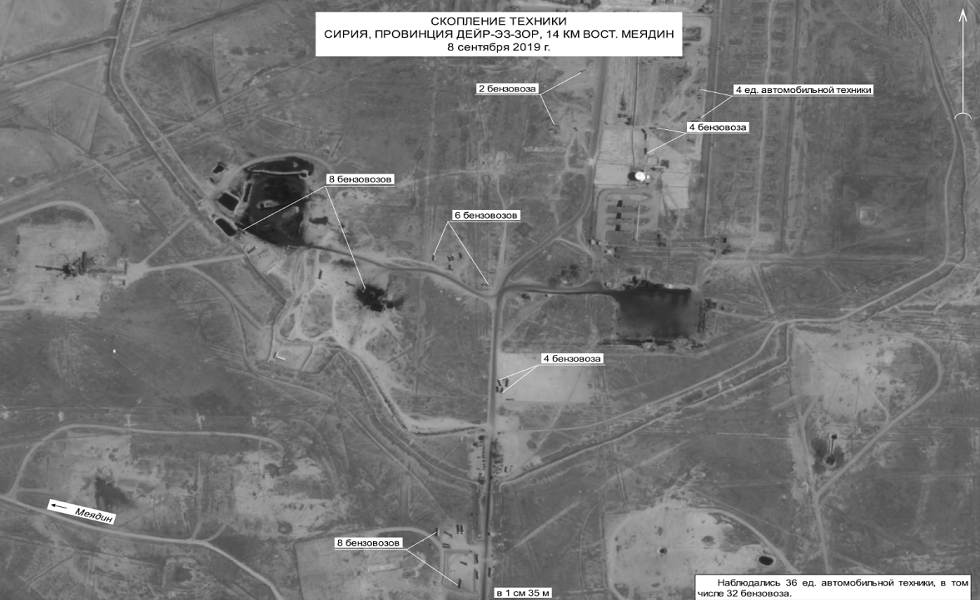 وتشير وزارة الدفاع إلى أنه يظهر في الصور قوافل الصهاريج التي تنقل النفط إلى خارج سوريا تحت حراسة العسكريين الأمريكيين وعناصر الشركات العسكرية الأمريكية الخاصة.