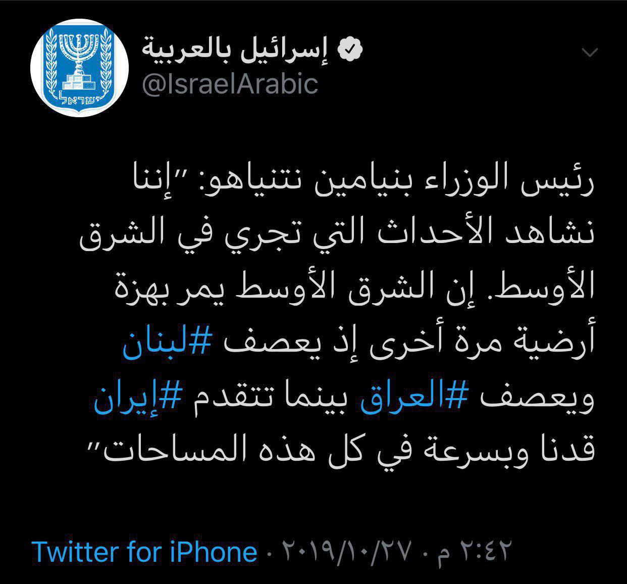 وزعم بنيامين نتنياهو على صفحة "إسرائيل بالعربية" على موقع تويتر: ״إننا نشاهد الأحداث التي تجري في الشرق الأوسط. إن الشرق الأوسط يمر بهزة أرضية مرة أخرى إذ يعصف لبنان ويعصف العراق بينما تتقدم إيران قدنا وبسرعة في كل هذه المساحات״.
