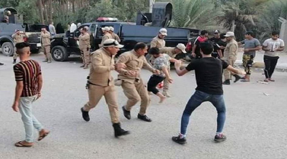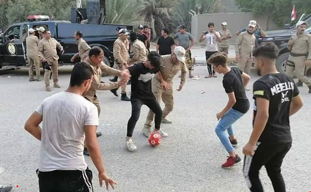 تداول ناشطون على مواقع التواصل الاجتماعي، صوراً لمباراة كرة قدم، بين المتظاهرين والقوات الأمنية في الديوانية.