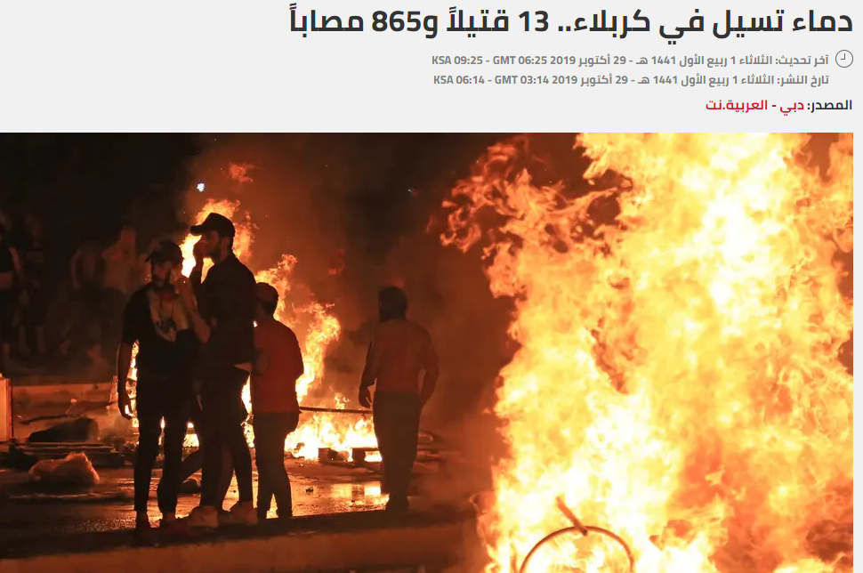 وفي تواطئ مكشوف من قبل الاعلام البريطاني والسعودي لنشر اكاذيب باسم مصادر (مجهولة)، نشرت قناة العربية السعودية خبرا تحت عنوان "دماء تسيل في كربلاء" نقلا عن مصادر لم تكشف عن اسمها (مجهولة) ان أكثر من 18 قتيلاً سقطوا في فض الاعتصامات في محافظة كربلاء مساء امس الاثنين، بينما قالت رويترز نقلا عن مصادر طبية وأمنية لم تسمها (مجهولة) إن 14 شخصا على الأقل قتلوا وأصيب 865 أثناء الليل بعدما فتحت قوات الأمن العراقية النار على محتجين في مدينة كربلاء.