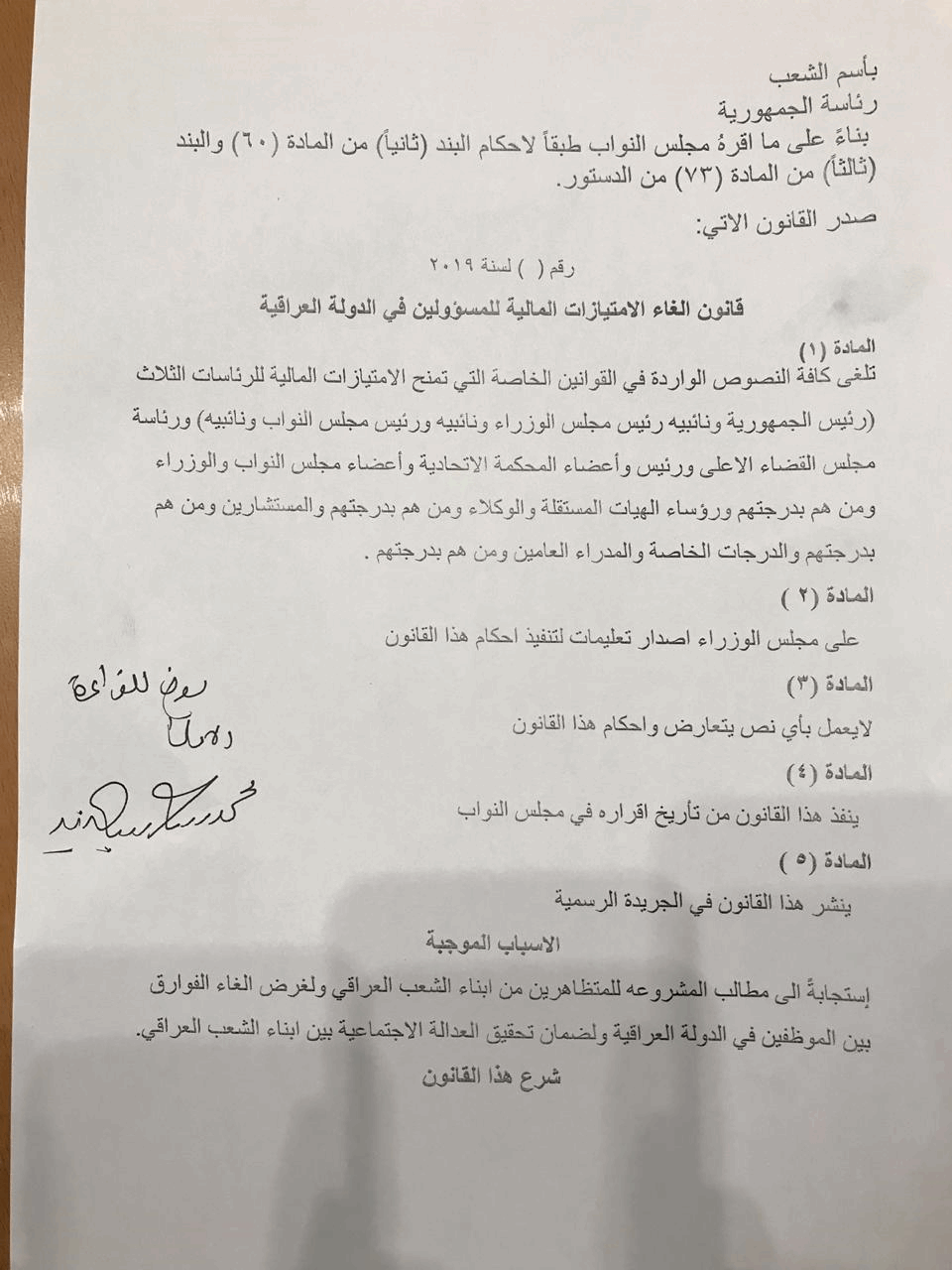 أصدر مجلس النواب العراقي، برئاسة محمد الحلبوسي، قانون الغاء امتيازات الرئاسات الثلاث والدرجات الخاصة الذي انهى البرلمان قراءة مقترحه اليوم الثلاثاء.