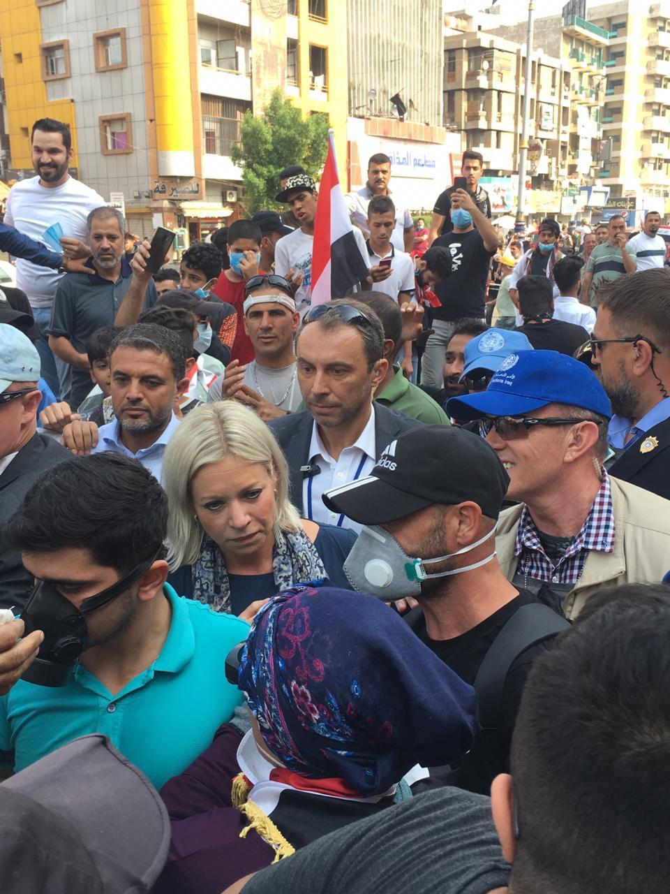 يذكر ان بلاسخارت التقت يوم الاثنين برئيس مجلس الوزراء العراقي عادل عبدالمهدي ، وأعربت رئيسة بعثة الأمم المتحدة لمساعدة العراق، عن أسفها واستنكارها لما رافق المظاهرات في العراق من أحداث عنف، داعية الجميع للوقوف ضد المسلحين الذين يتسللون بين المتظاهرين السلميين.