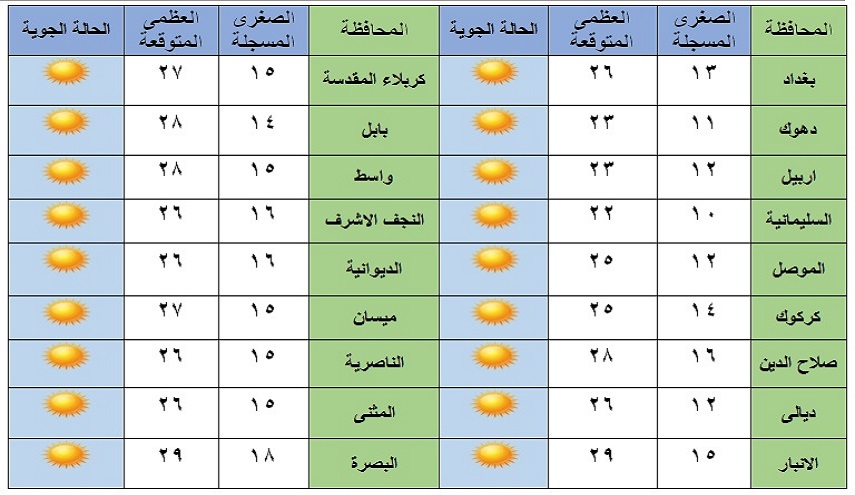 وذكر بيان للهيأة ان "طقس يوم غد السبت سيكون في المنطقة الوسطى، صحواً مع قطع من الغيوم، وفي المنطقة الشمالية غائما جزئيا واحيانا غائم مع تساقط زخات مطر في الاقسام الجبلية منها, وفي المنطقة الجنوبية، صحواً مع قطع من الغيوم" مشيراً الى، ان "درجات الحرارة العمى بمدينة بغداد ستكون بمعدل 26 مْ".
