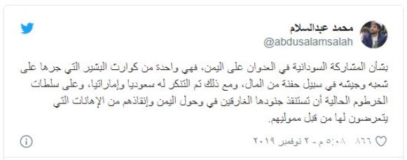 وقال عبدالسلام، في تغريدة له، عبر حسابه على "تويتر": "تم التنكر للبشير سعوديا وإماراتيا، وعلى سلطات الخرطوم الحالية أن تستنقذ جنودها الغارقين في وحول اليمن وإنقاذهم من الإهانات التي يتعرضون لها من قبل مموليهم".